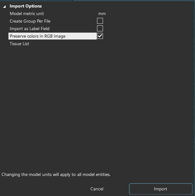 在 Sim4Life 上方工具栏选择 Imp/Export,选择要导入的彩色影像,然后在 Import Options 勾选 Preserve colors in GRB image
