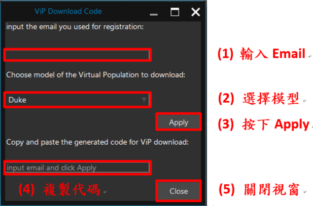 2. 在 ViP Download Code 视窗输入 Email,选择要下载的模型。完成后按下 Apply 并复制生成的代码