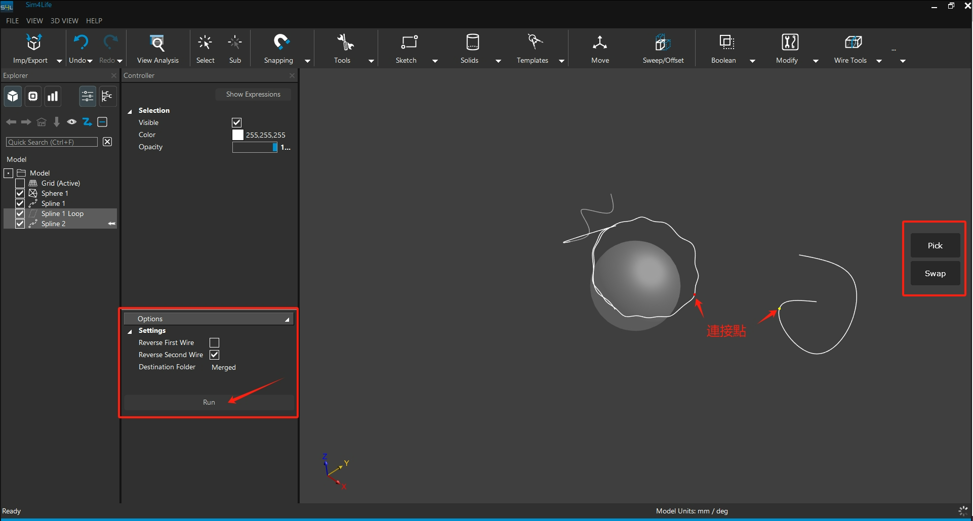 可使用右侧控制区中的「Pick」选取点位置,「Swap」可将点切换至另一条线上