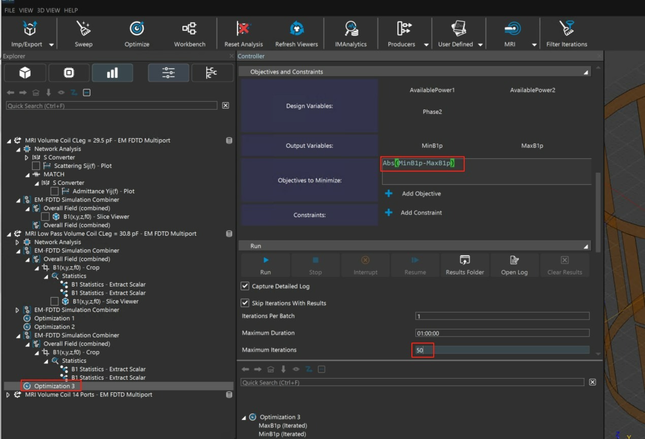 1. 选择Optimization,在Controller窗口使最小值和最大值的差尽可能最小,通过这种原理使B1场均匀化,在run窗口选择最大迭代次数为50次。
