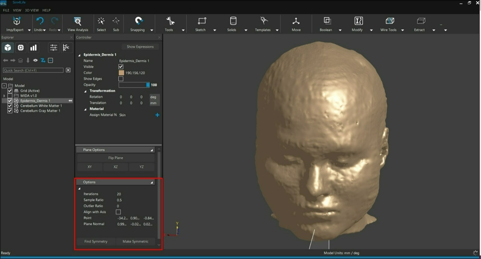 Point : 定义对称平面上的一个点。此值通常由「Find Symmetry」自动计算。可手动微调