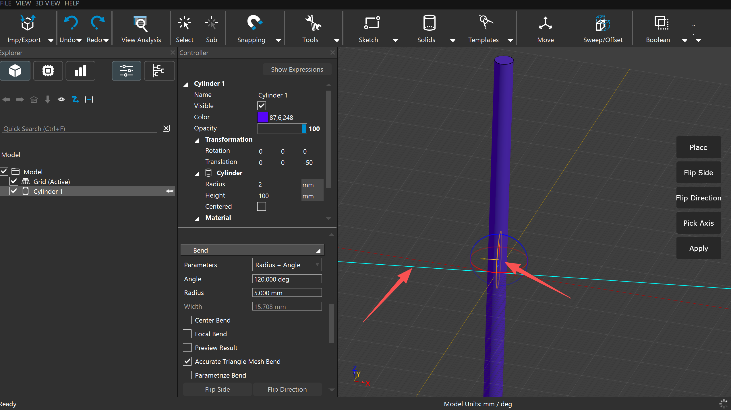 2、首先选择模型Cylinder1,然后选择Bend Part