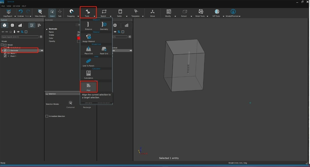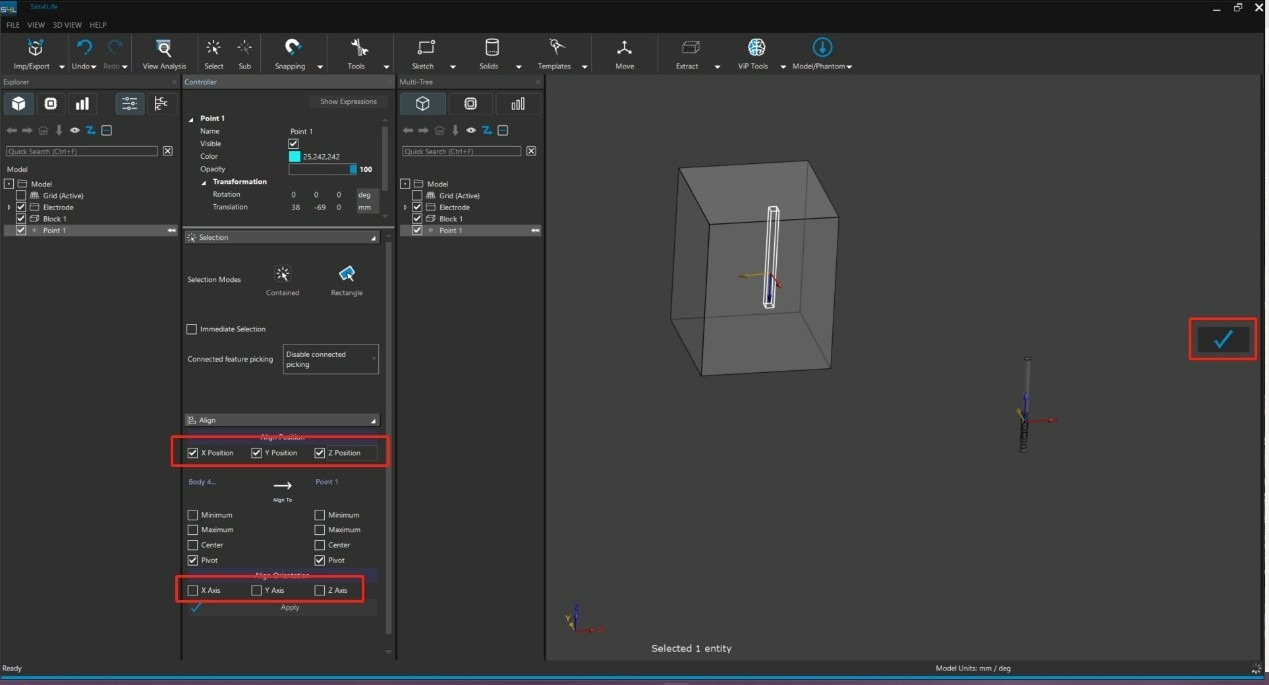 选择欲对齐的模型物件,点选上方选单列中的 Tools > Align,此时在右侧的 Controller 区块下方会显示 Align 设定介面