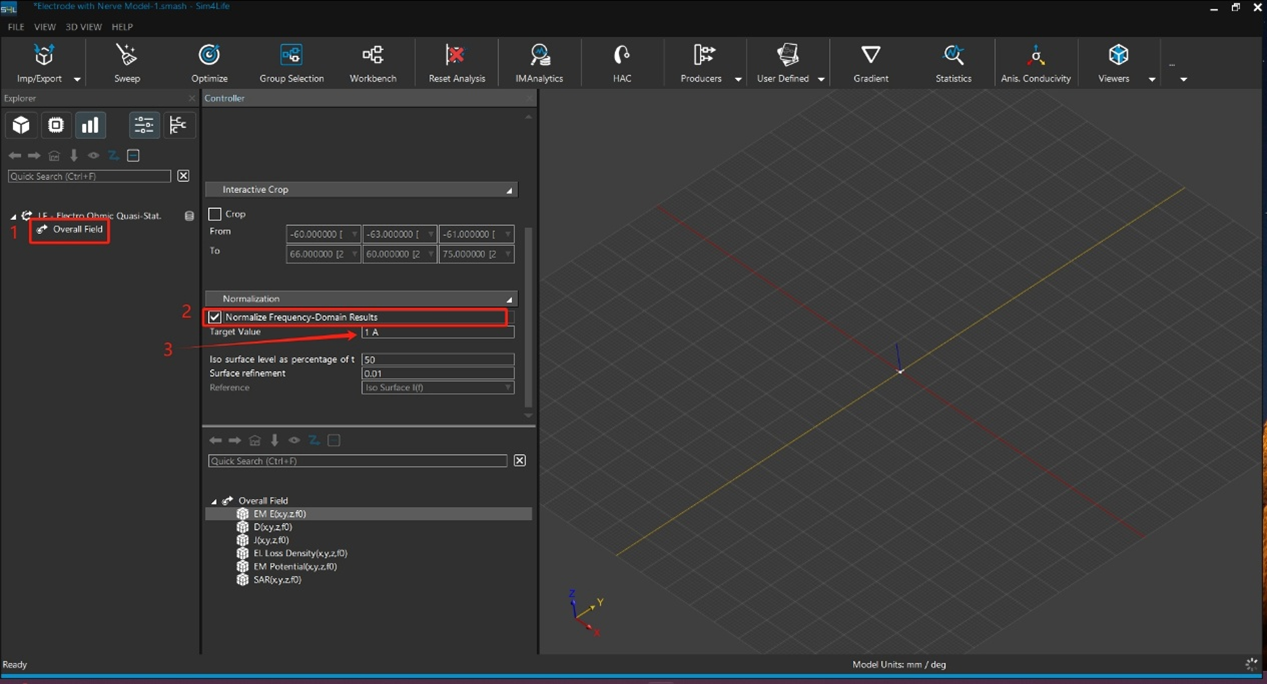2.点选该 Overall Field 物件,展开右侧的 Controller 区块,并将画面滑至最底 部,勾选「Normalize Frequency-Domain Results」选项,此操作会在下方显示出 电流设定栏位
