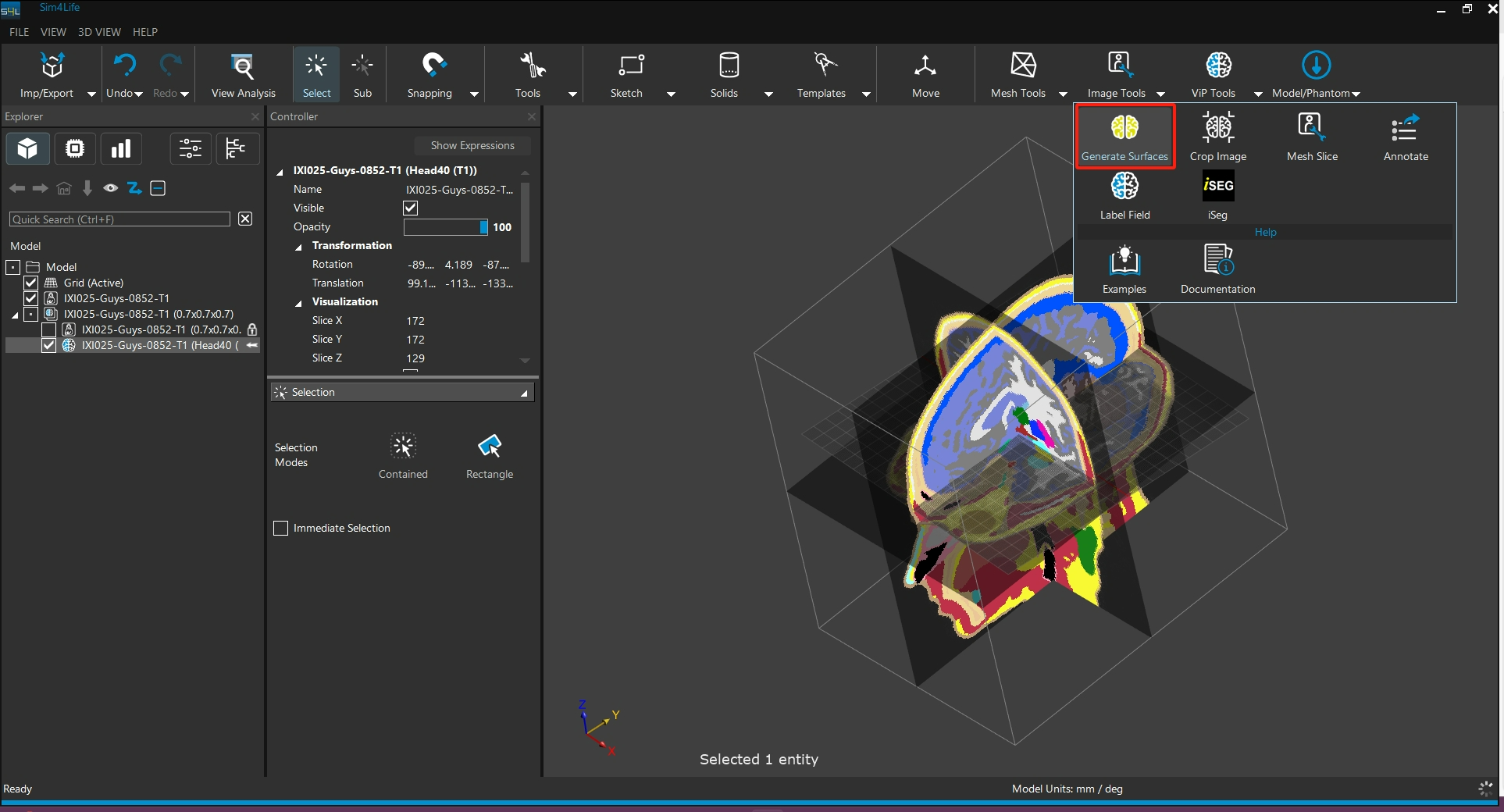 4.选择以标注的影像名称 |X|025-Guys-0852-T1(Head(T1)),然后在上方工具栏点选Image Tools>Generate surfaces