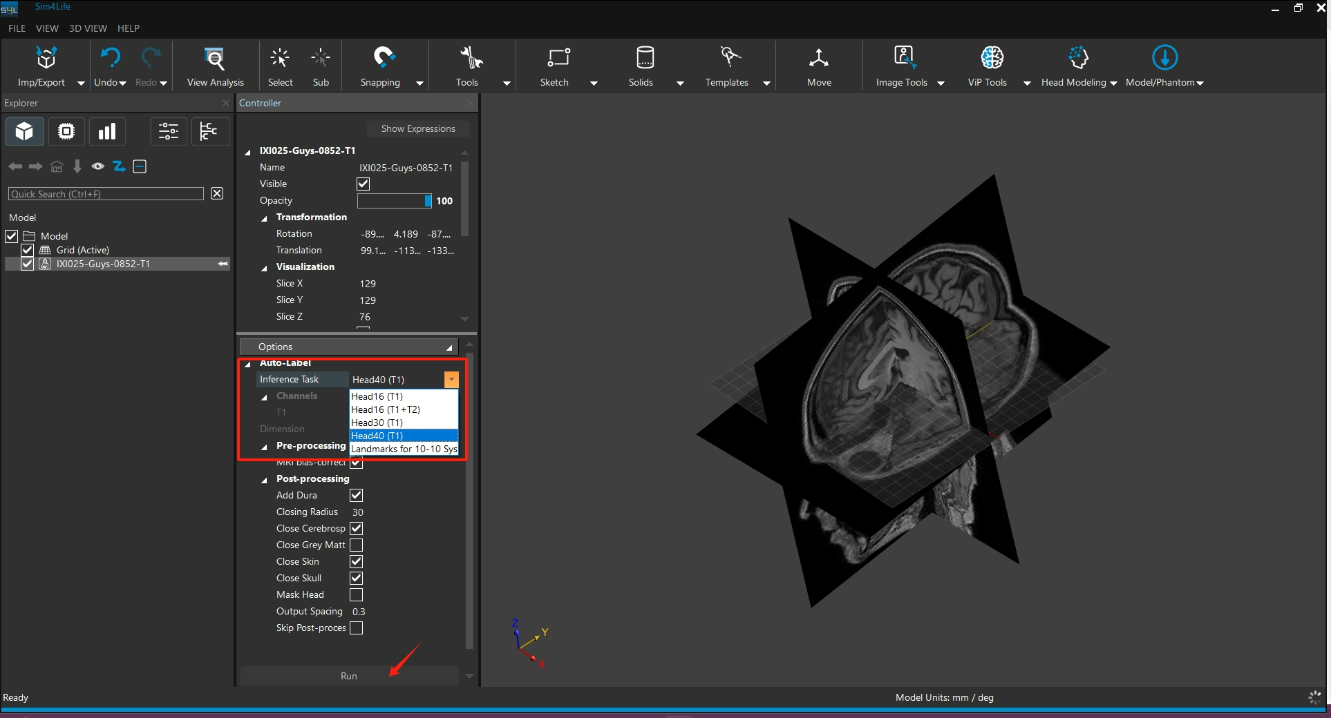 3.在 Options 窗口设定 Inference Task,Head40(T1)代表标注 40 个组织,点选 Run 进行组织标注