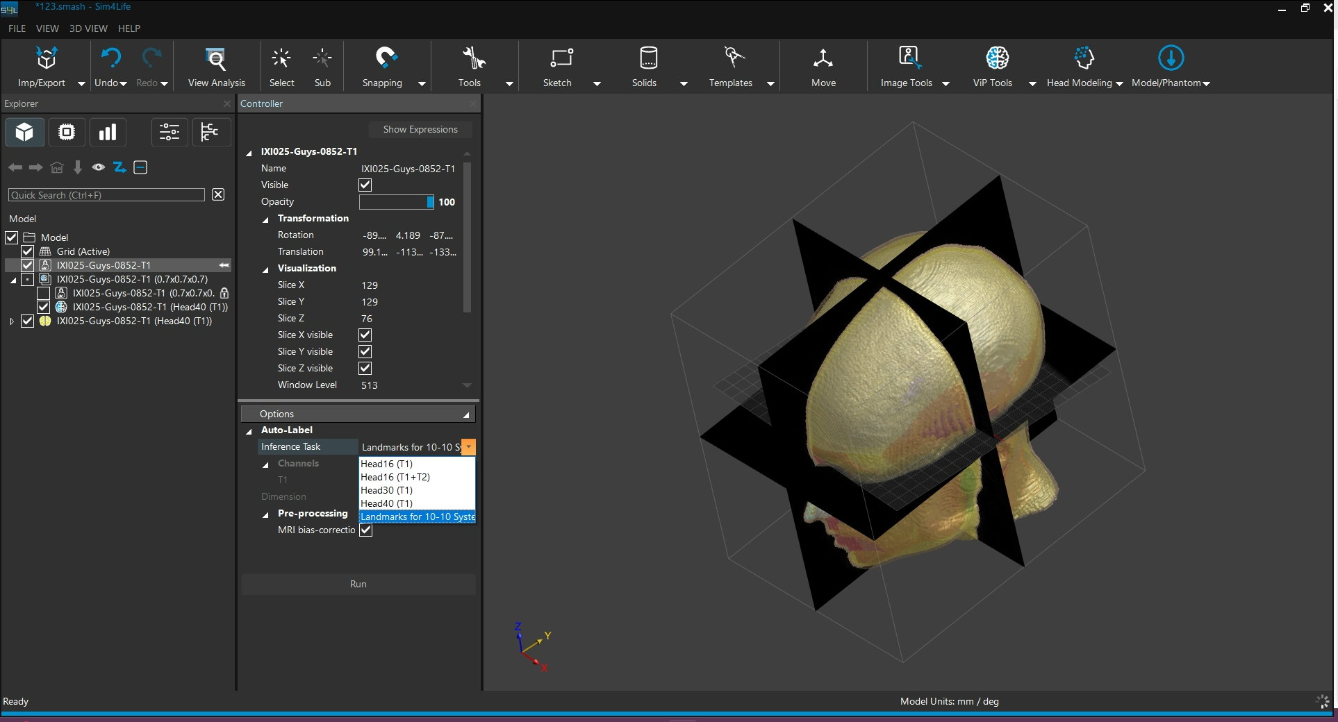 8.同时选取 3D 模型|X|025-Guys-0852-T1(Head40(T1))中的"Skin"对象与四个参考点后,在上方工具字段点选 Head Modeling > 10-10 System