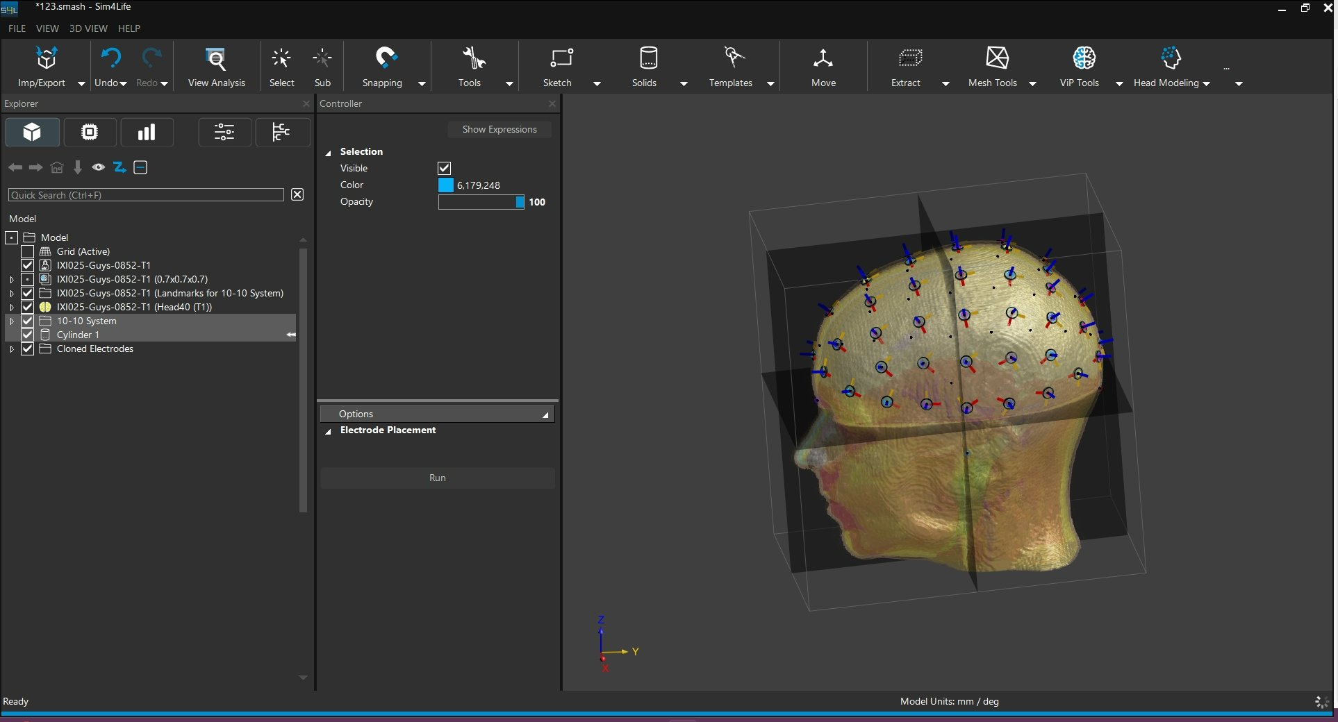 10. 绘制一个置于原点的圆柱电极(Radius: 4mm, Height: 1mm),同时选取 10-10 System 与电极后,在上方工具栏点选 Head Modeling > Electrode Placement