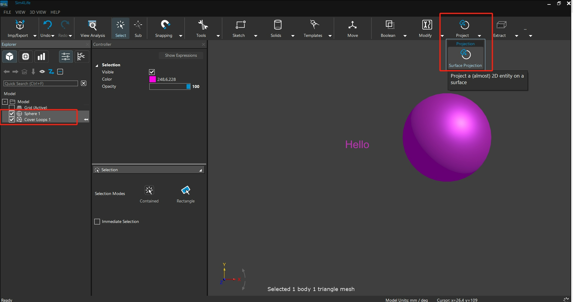 同时选取「文字实体」与「目标模型」,点选上方功能列中的「Project」→「Surface Projection」
