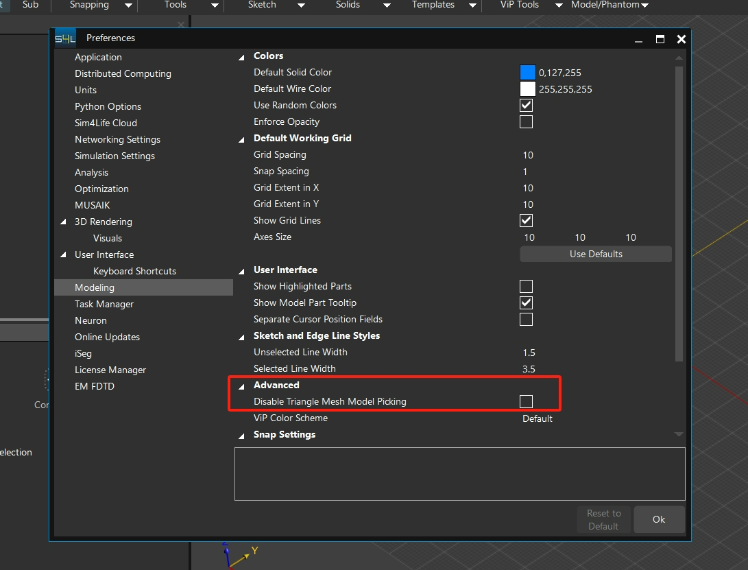 在FILE > Preferences点选Modeling,在Advanced取消勾选Disable Triangle Mesh Model Picking并按下Ok ( 若原本就未勾选,则可略过此步骤,直接进行下一步操作 )