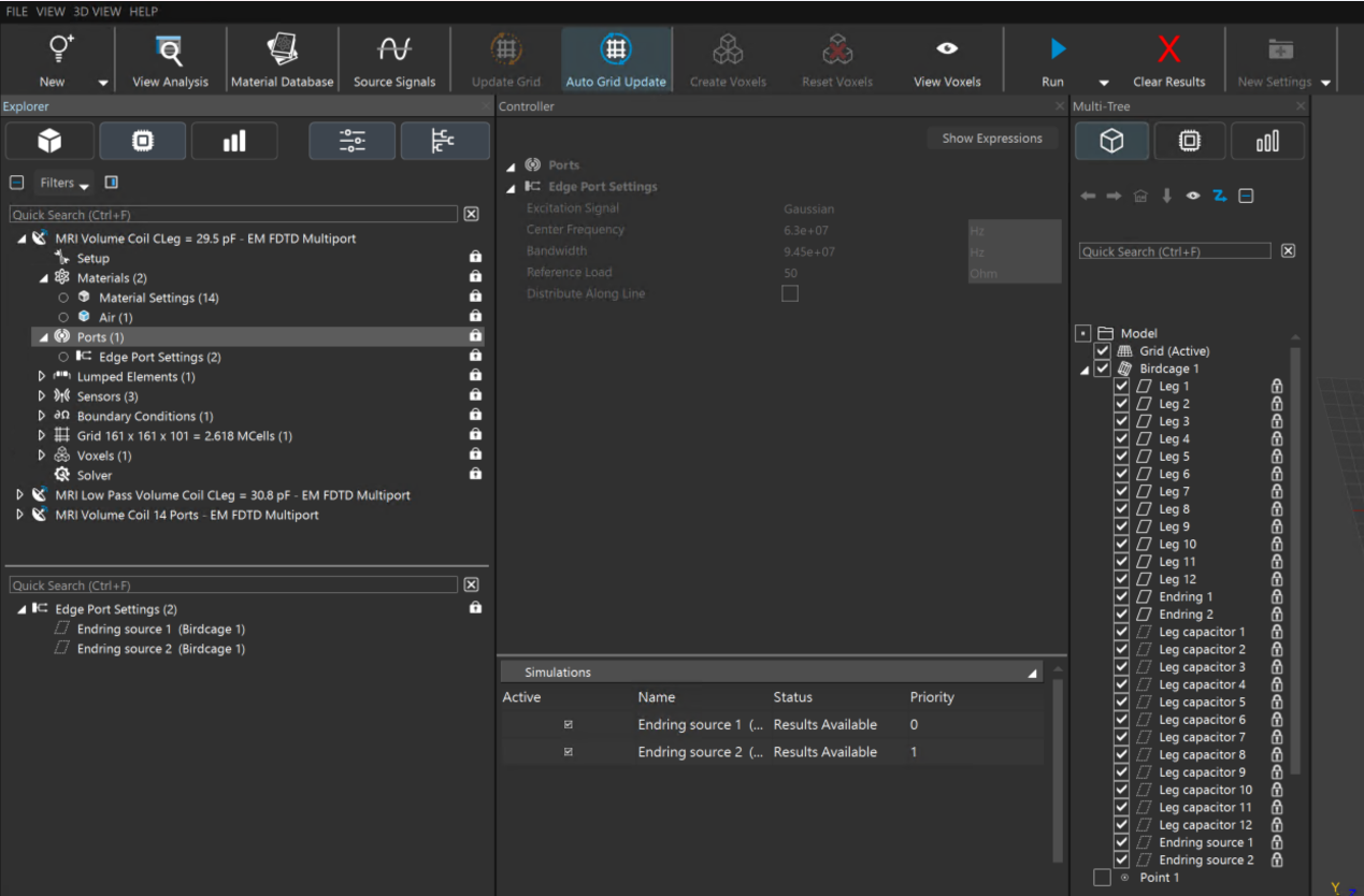 4. Port设置:右键新建Edge Port Setting文件夹,将两个激励源Endring source1和Endring source2放进Edge Port Setting里面,Controller窗口选择Guessian信号类型,中心频率63MHz,带宽94.5MHz