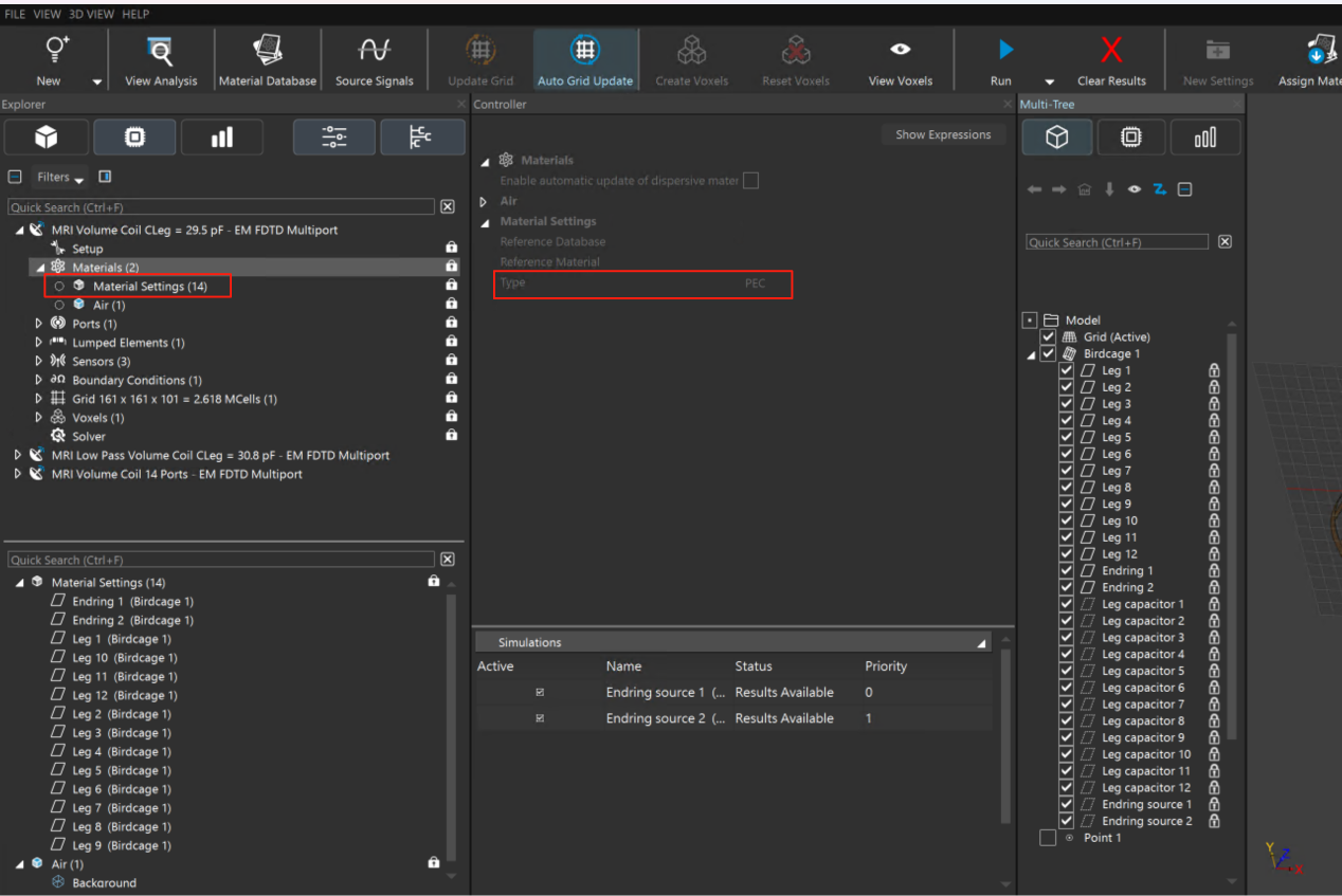 3. Material材料设置:将鸟笼线圈的12个支腿和两个端环放进新建的Material setting的文件夹,并将材料设置为PEC材料,然后选择update Materials