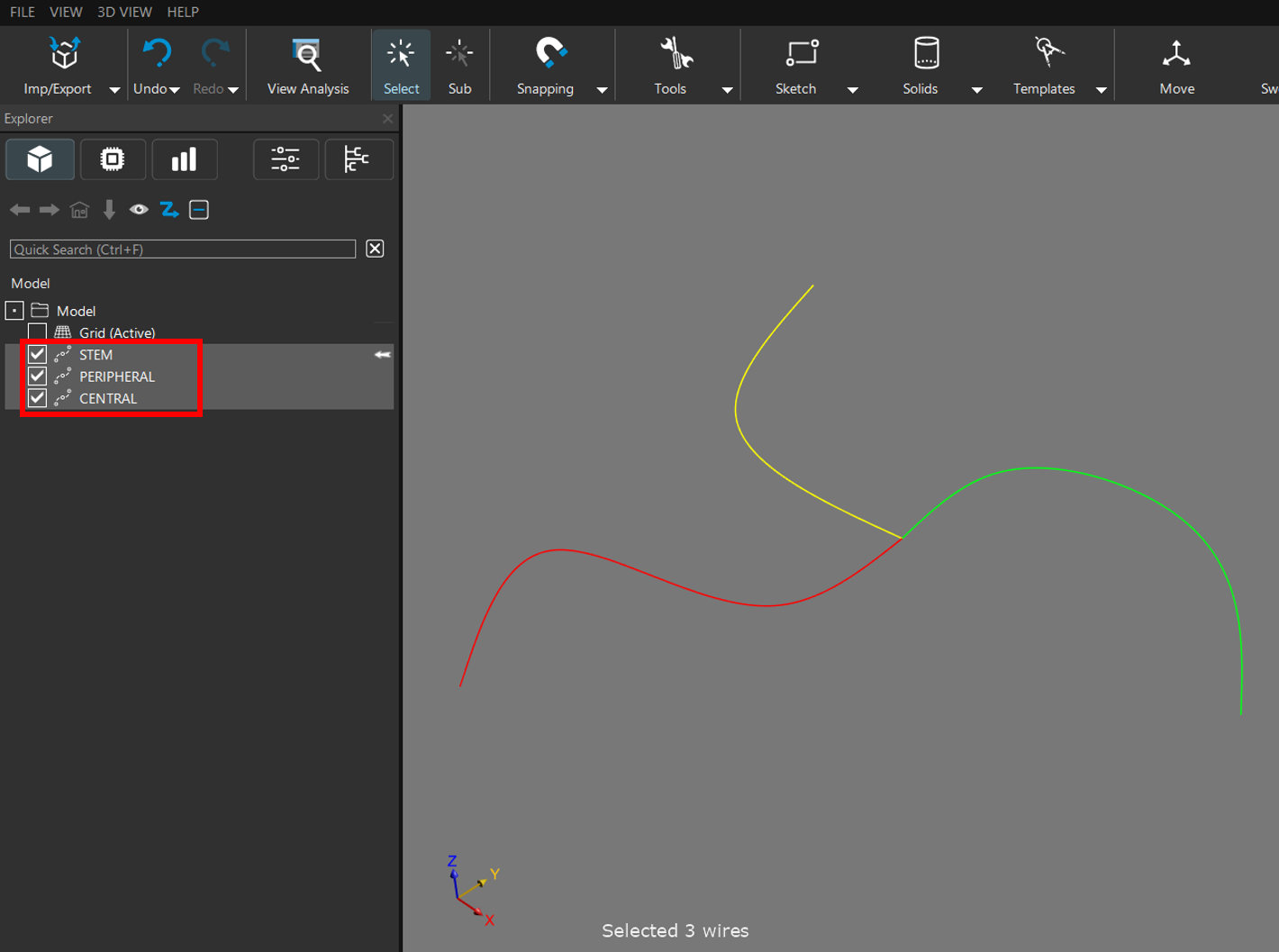 1. 在建模接口选择工具字段的 Sketch | Spline,绘制三条相交于一点的样条线且将样条线依照以下名称约定进行命名(区分大小写): STEM、PERIPHERAL、CENTRAL