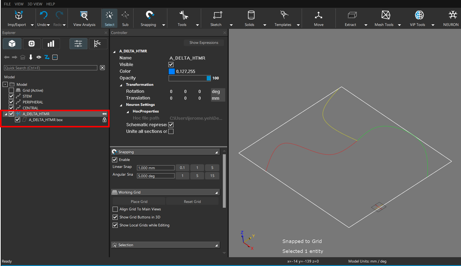 2. 同时选取三条样条线(STEM、PERIPHERAL、CENTRAL),然后在工具字段点选 NEURON | Neuron A-Delta Fiber 工具,Controller 窗口中的 Options 区块会出现纤维参数设定,包含纤维型态(A-delta HTMR/LTMR)、温度与 HOC 参数选项等。点选 Run 以生成 A-Delta 纤维模型。
