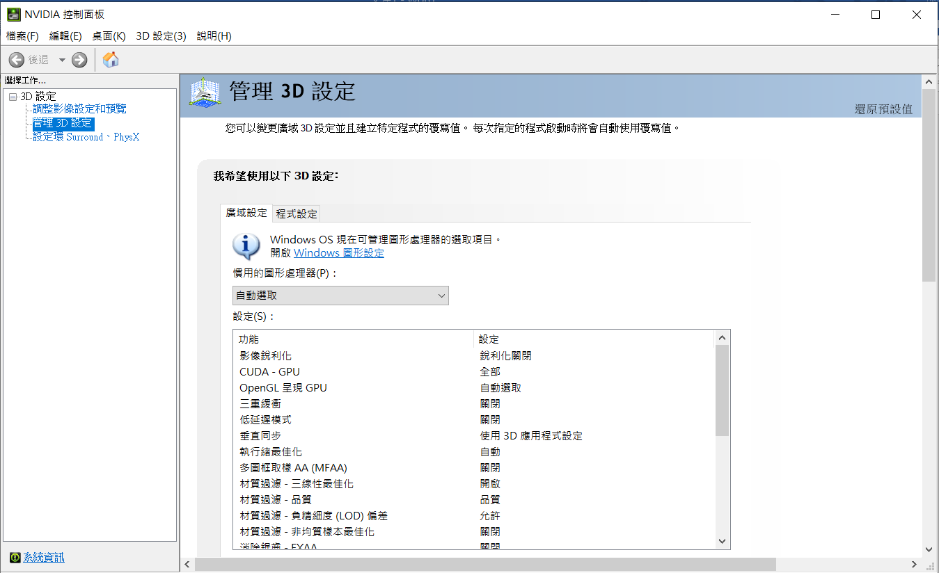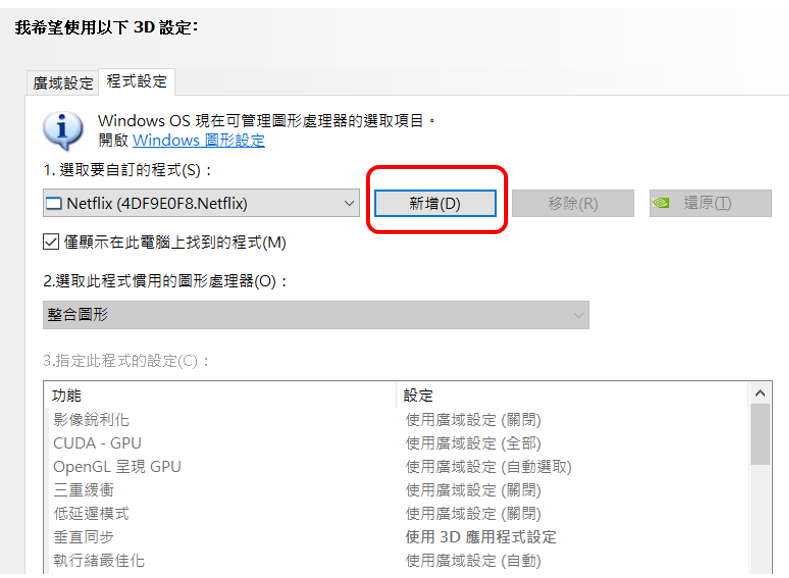 3. 在 "管理 3D 设定" 选择 "程序设定" 页面,然后点击 "新增"