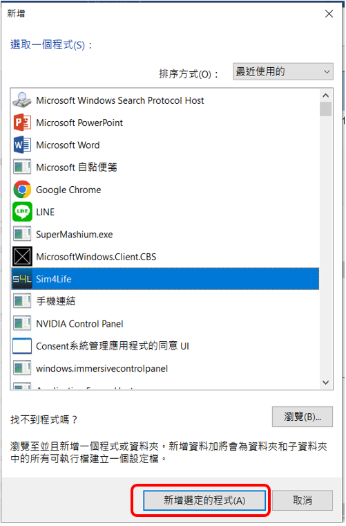 4. 选择 Sim4Life 名称,然后点击 "新增选定的程序"