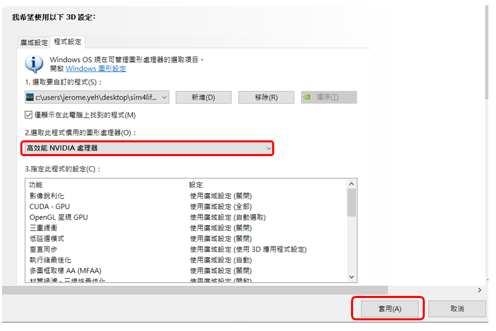 5. 在 "选取此程序惯用的图形处理器(O)" 选择 "高效能 NVIDIA 处理器",然后点击 "套用"