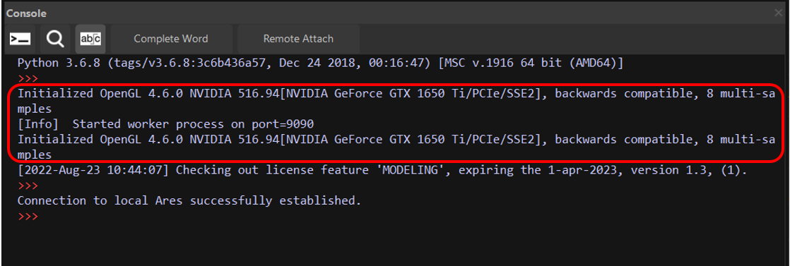 6. 开启 Sim4Life 的 Console 窗口,确认显示适配器的信息与 OpenGL 的版本已更新