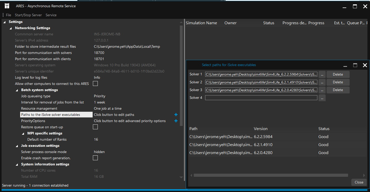 2. 確認 iSolve.exe 的 Status 皆為 Good,若出現 unknown,請選擇目前 Sim4Life 版本所對應的 iSolve.exe 路徑