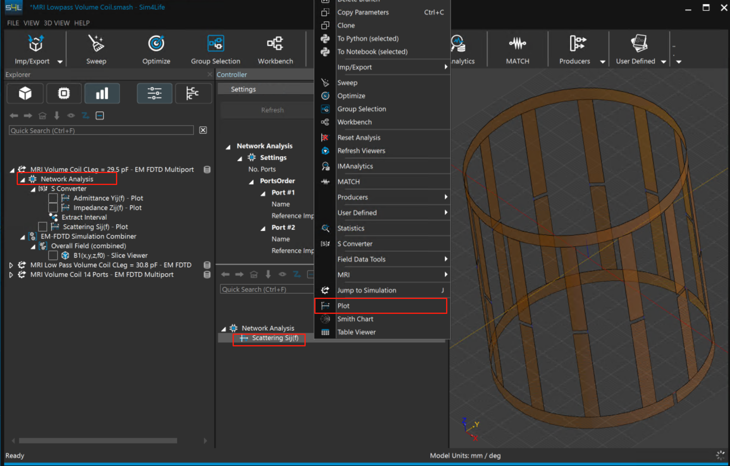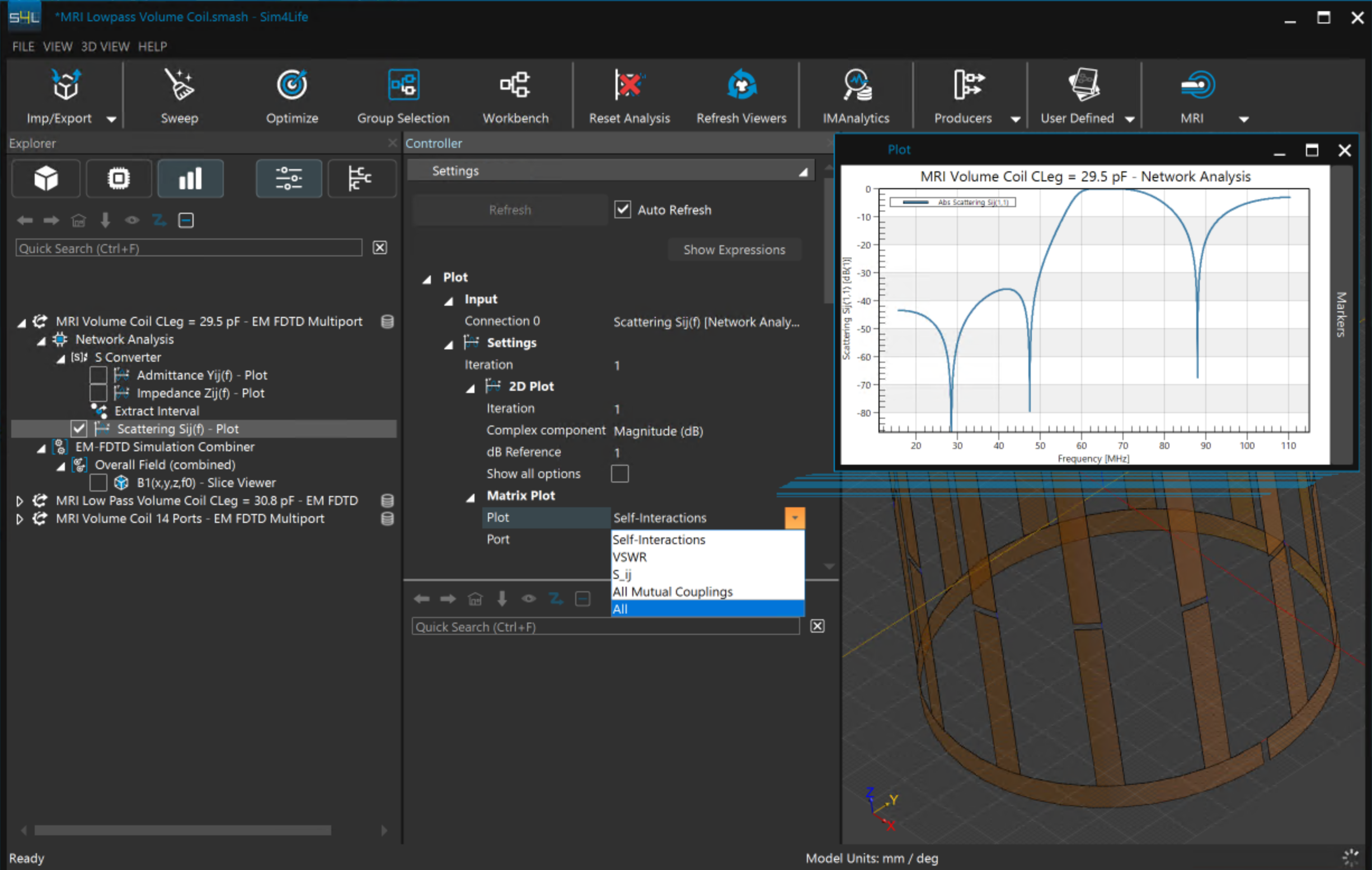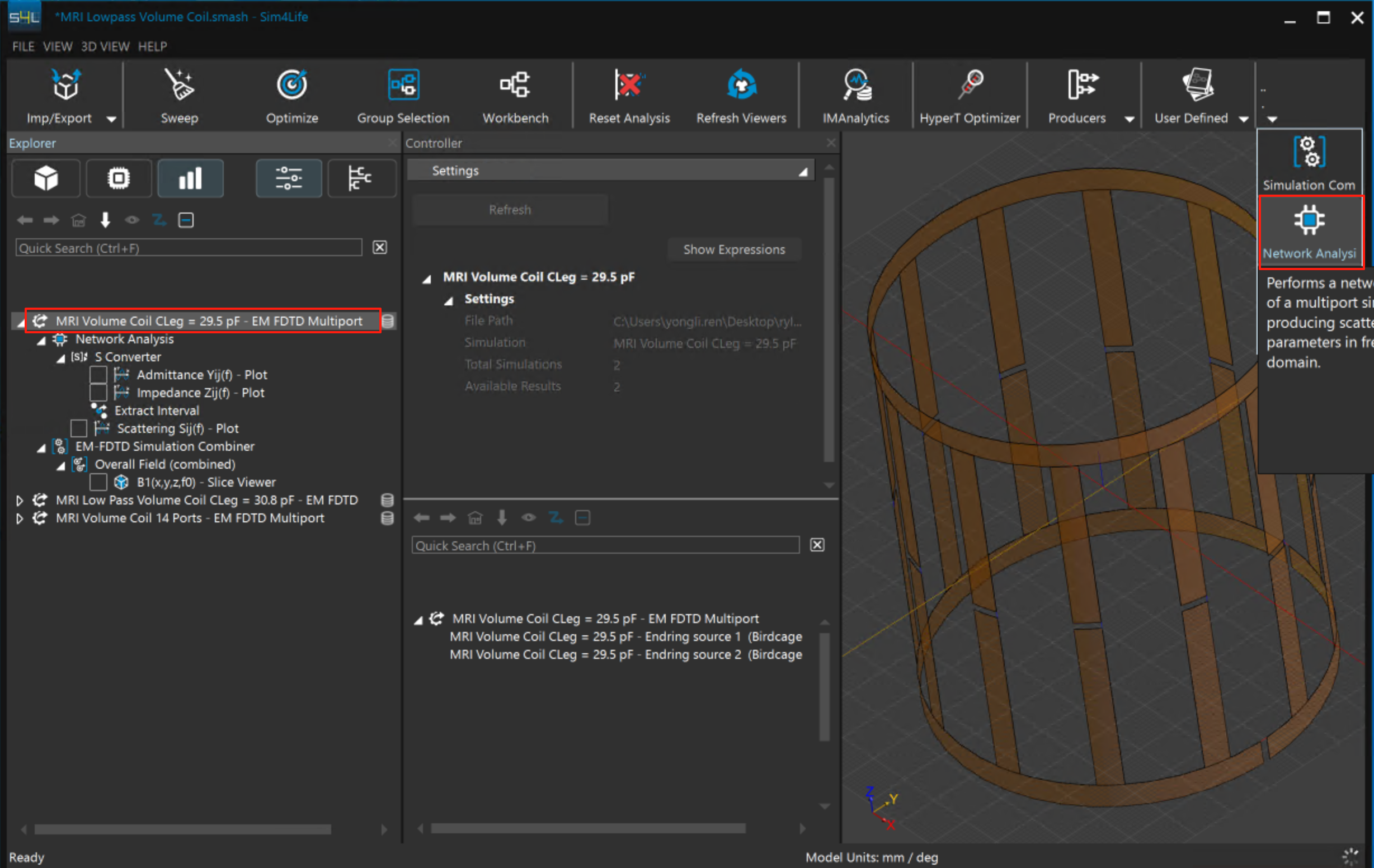 1.     選擇模擬結果MRI Volume Coil CLeg = 29.5 pF,選項卡中選擇Network Analysis