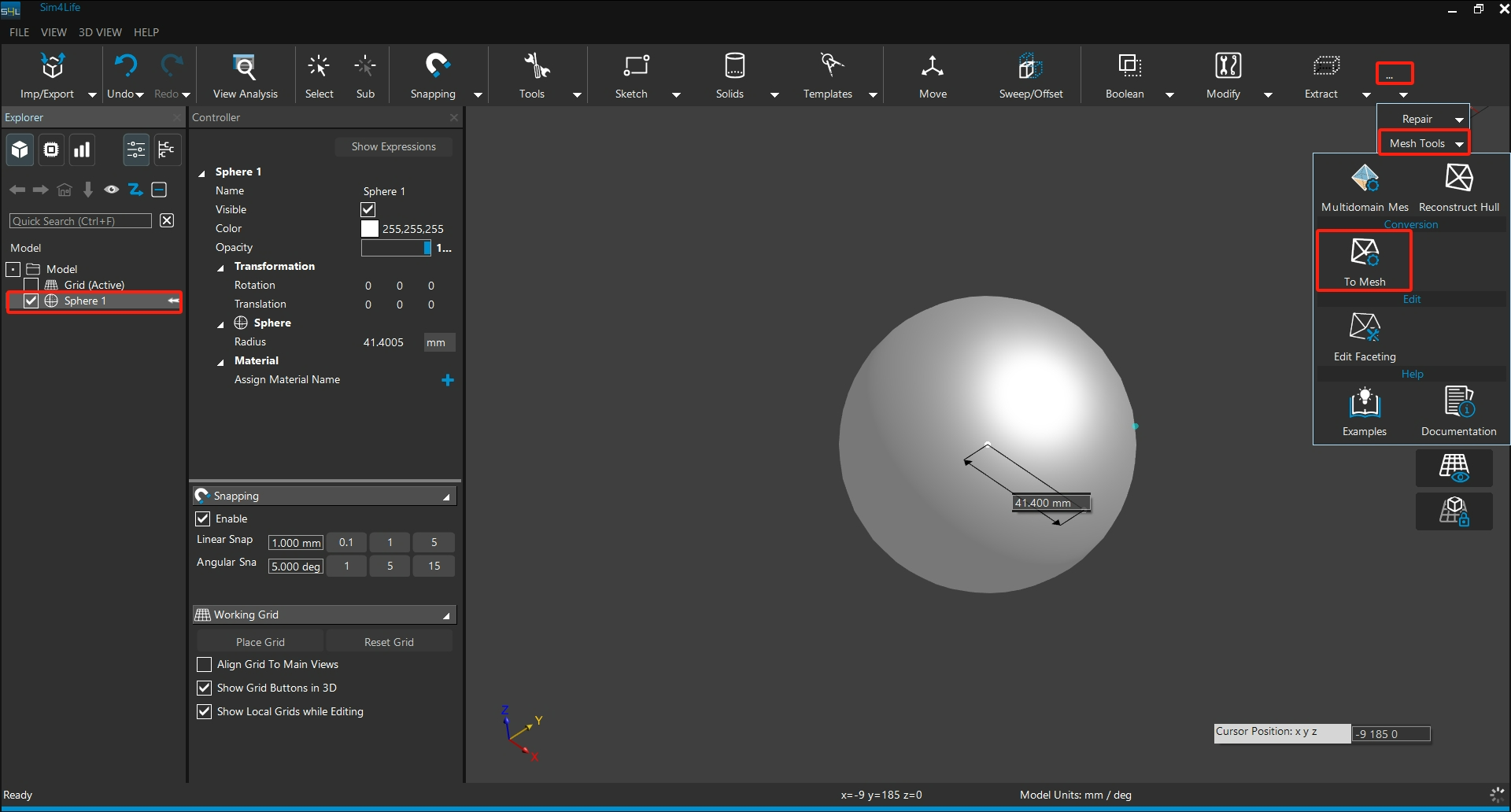 選取模型,執行 Mesh Tools → To Mesh,將其轉換為網格格式