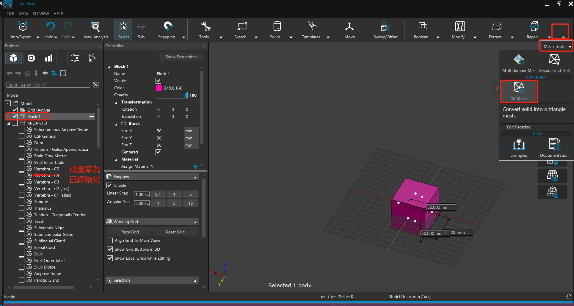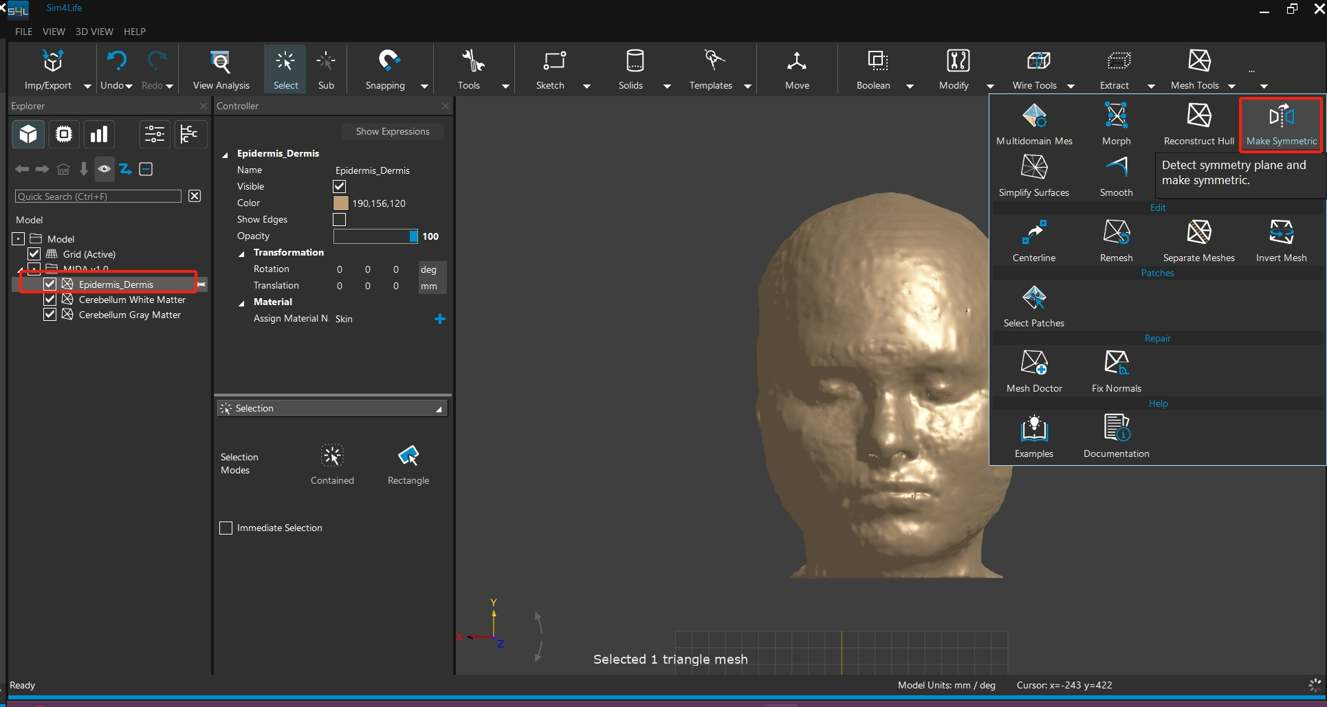在 Explorer 的 Model 介面中,選取欲進行對稱操作的模型。若該模型尚未為 mesh 格式,請先使用 To Mesh 功能將其轉換為可編輯的網格物件。