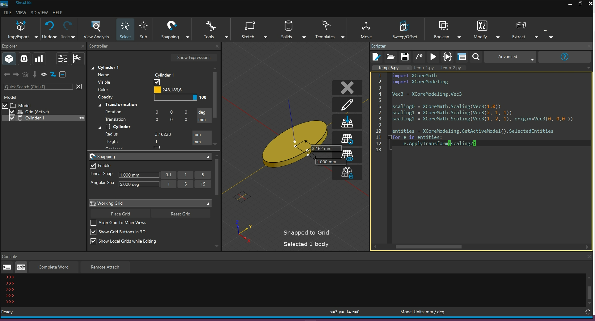 4.如果你的模型是用腳本建立的,那可以將 "for e in ..." 改掉,換成Cylinder.ApplyTransform(scaling1),前面的Cylinder可改成模型名稱