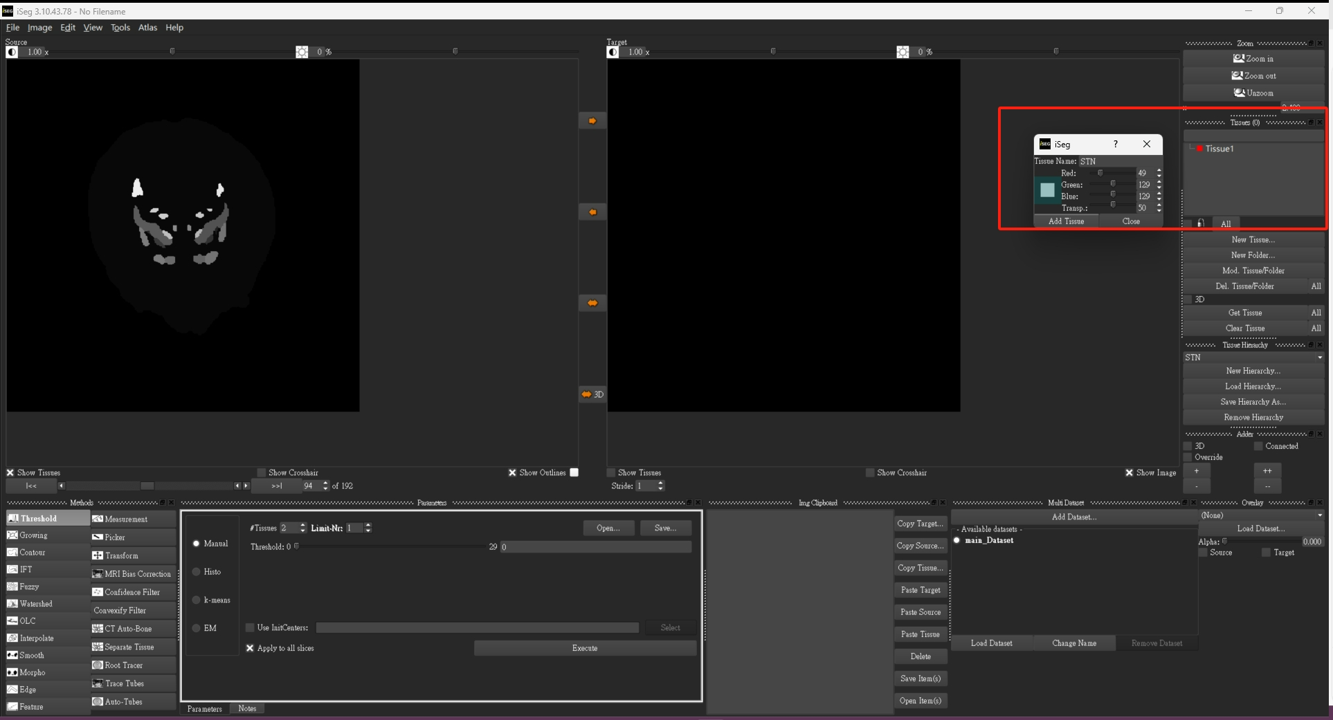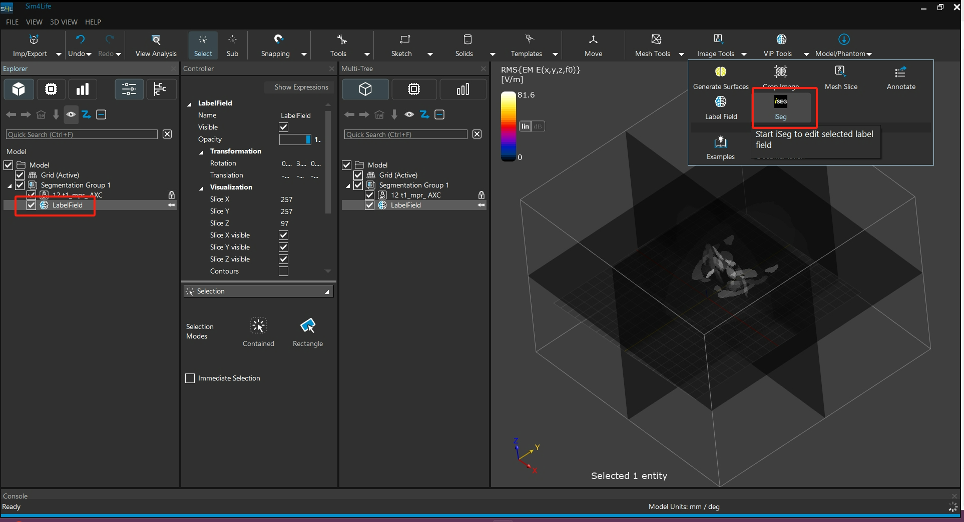 3. 在 Multi-Tree 中選取 LabelField → 點選 Image Tools → iSeg 系統會開啟 iSeg 視窗