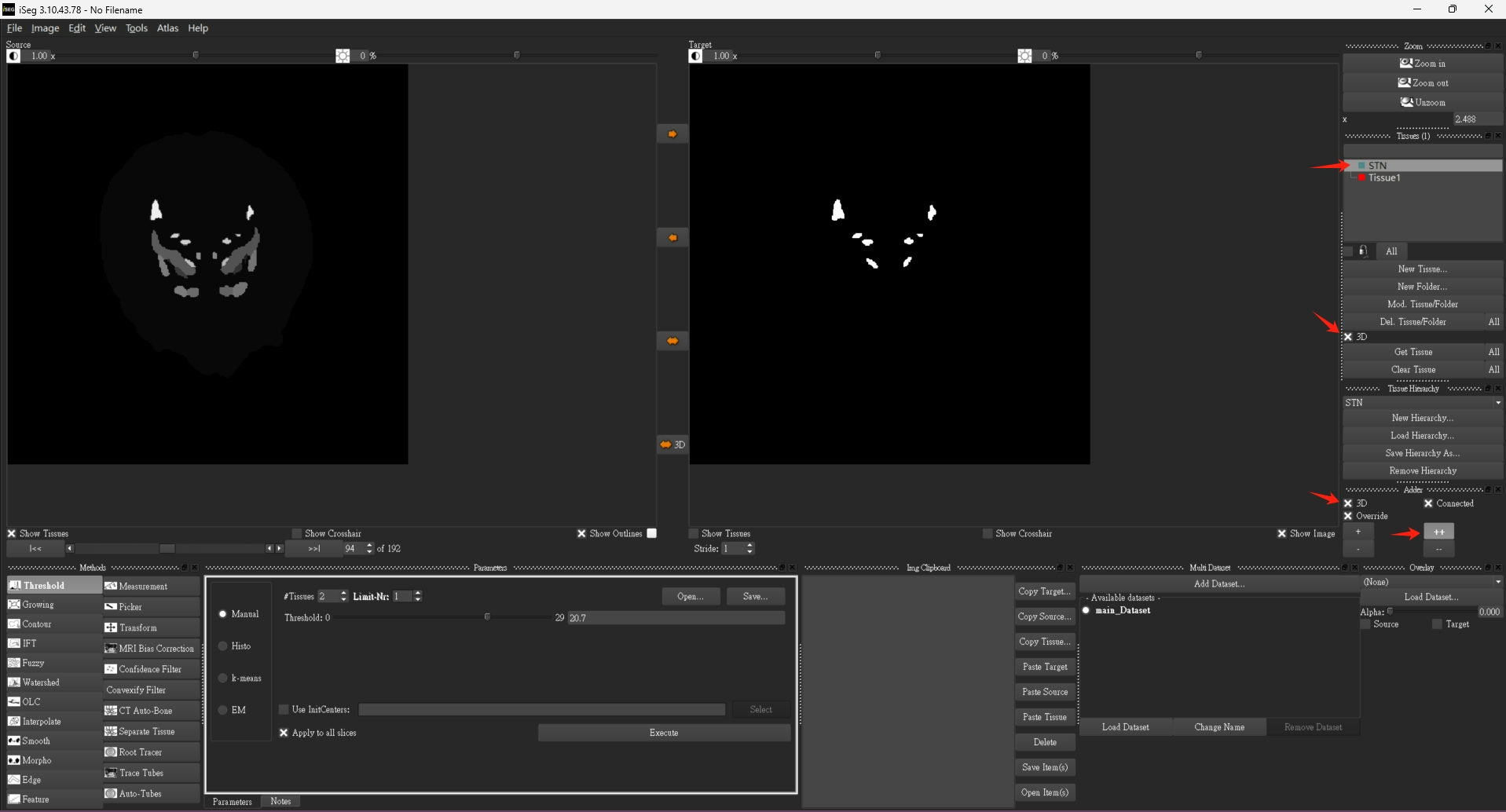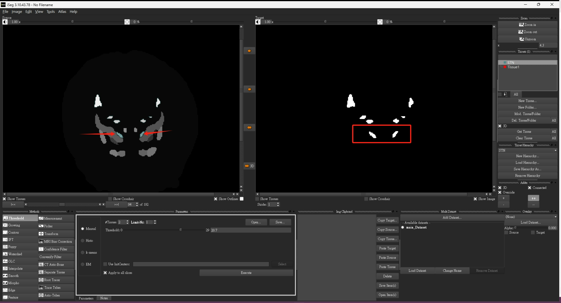 調整上下限閾值,直到「Target」區域出現清楚的組織輪廓