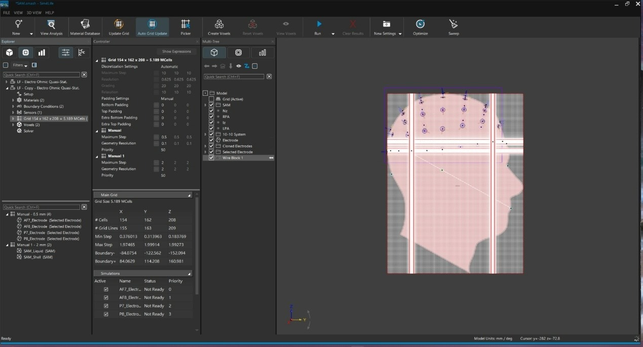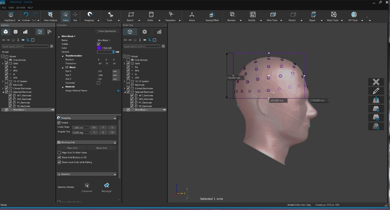 切換至模擬設定介面選擇 Grid , 原本會將整個模型加入 Grid 中,但此處僅需將剛剛建立的 Wire Block 加入 Grid 區塊,即可指定細化區域。