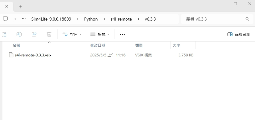 3. 在 Sim4Life 文件夾路徑  C:\Program Files\Sim4Life_9.0.0.18809\Python\s4l_remote\v0.3.3  選擇 s4l-remote-0.3.3.vsix 檔案