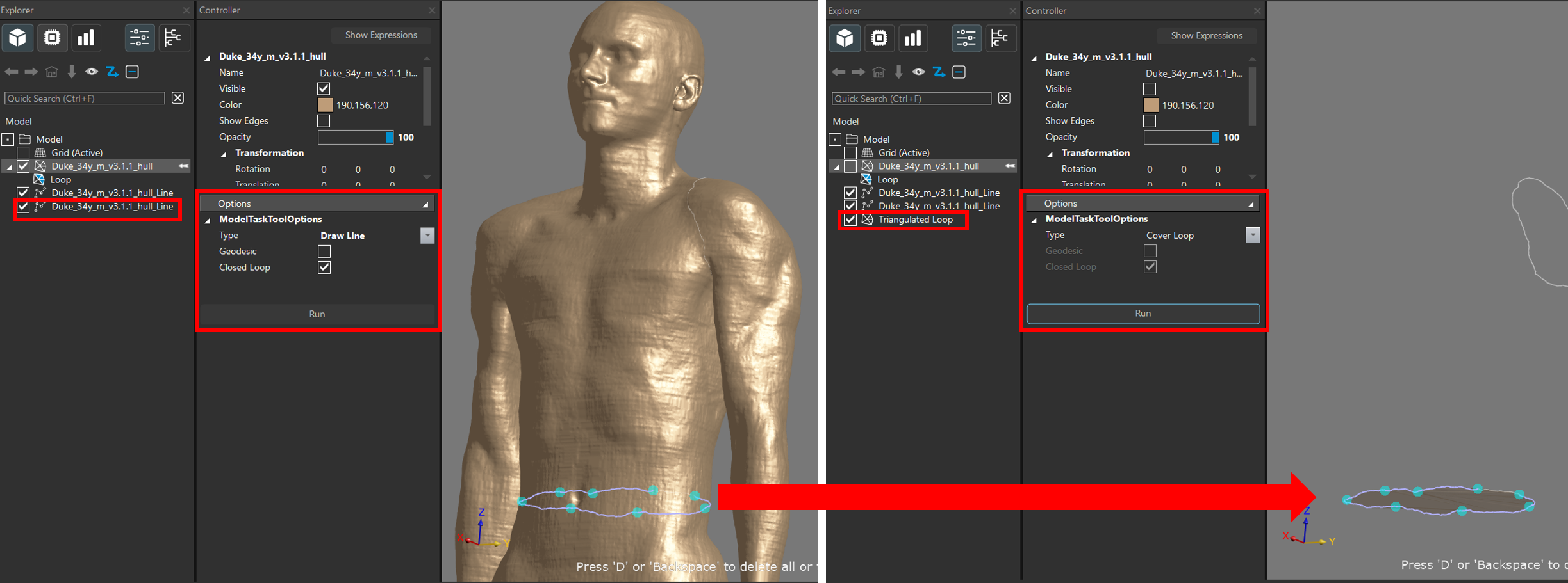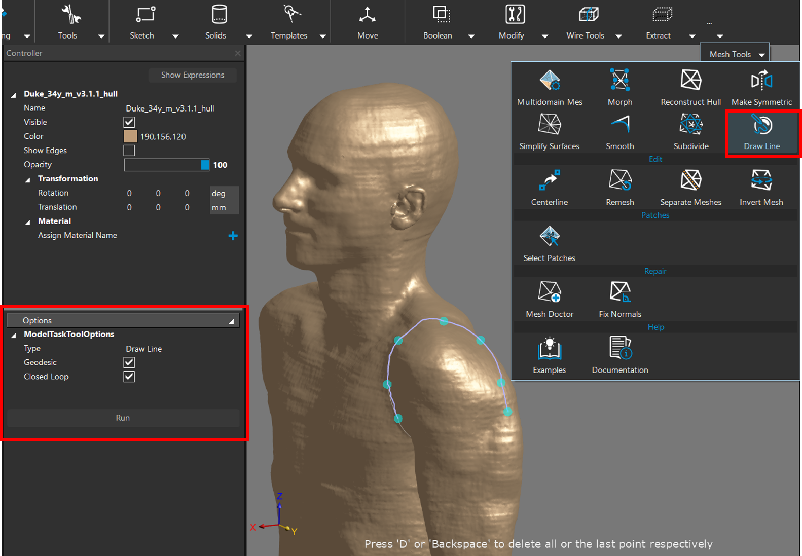 右圖顯示的是 Duke 人體殼層模型,我們在 Explorer 視窗選擇 Duke_hull 模型後,點選 Sim4Life 介面上方工具欄的 Mesh Tools | Draw Line。Controller 視窗中的 Options 區塊會出現 ModelTaskToolOptions 的選項設定。在 Draw Line 模式下,我們可以在 Duke 殼模型表面上選擇要繪製封閉線的部位,然後依序建立系列點模型。完成後勾選測地線(Geodesic)與封閉迴圈(Closed Loop)並點選 Run 按鈕,就能生成一個圍繞人體表面區域的封閉曲線。