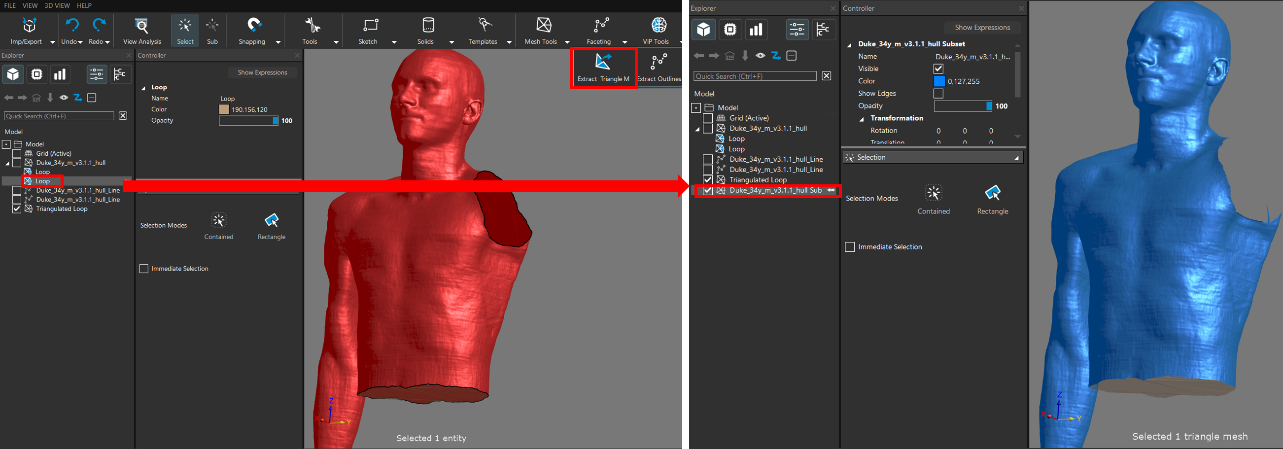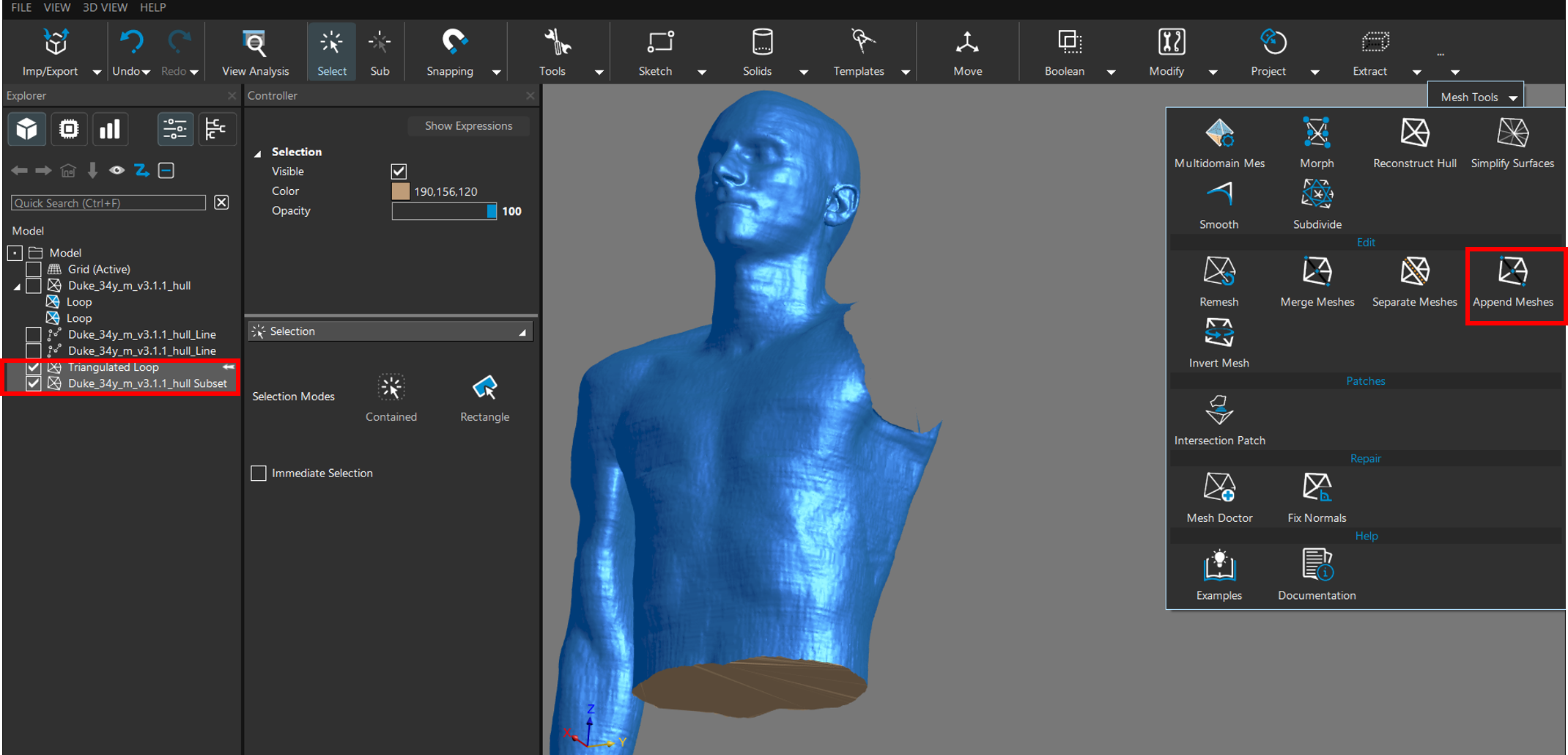 另外,我們進一步可將覆蓋封閉曲線的表面網格(Surface Mesh)模型與 Duke 上半身的補丁模型相接合。在 ModelTaskToolOptions 的選項設定中選擇 Create Patch 模式並點選 Run 按鈕後,即建立 Duke 上半身的表面補丁模型模型(名稱: Loop),如上圖所示。