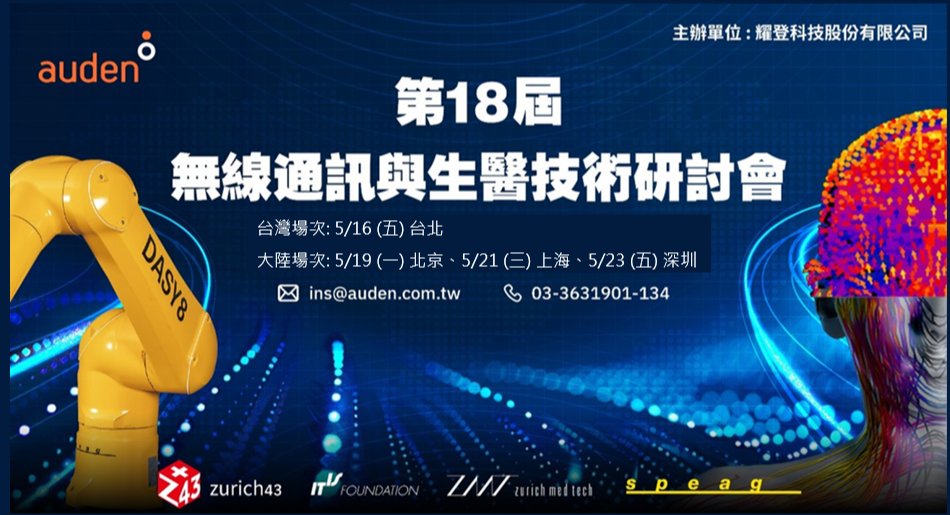 耀登科技將於 5/16 (五) 台北、5/19 (一) 北京、5/21 (三) 上海、5/23 (五) 深圳四地舉辦第 18 屆無線通訊與生醫技術研討會。本次活動集結國內外電磁測試、生醫模擬、毫米波、SAR、非侵入式刺激、MRI 安全性、Sim4Life 平台等專業領域權威,深入剖析最新技術趨勢、法規變動與應用實務。